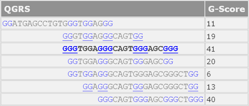In order to focus our studies on an unambiguous sequence, we have used a scoring system which rewards an arrangement that is likely to form an intramolecular quadruplex (see the section Understanding G-Scores for more details). QGRS Mapper will start with a nucleotide sequence, find all QGRS occurring in the sequence and then produce a non-overlapping set of QGRS. Overlaps are eliminated by selecting the higher scoring QGRS.