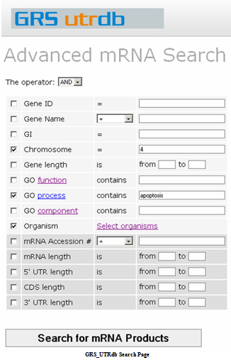 Suppose we want to analyze human and mouse mRNAs of genes that play a role in RNA binding. Also suppose that we want to examine mRNAs with fairly long 5' and 3' UTRs. We could use the following search parameters