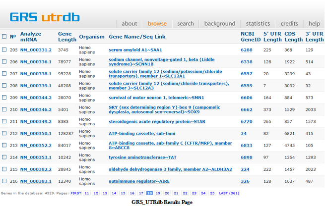This results in several hits. The first page of results is shown below. The results may be sorted using any of the columns. For example, sorting by Gene Size arranges the genes in increasing order of gene size.