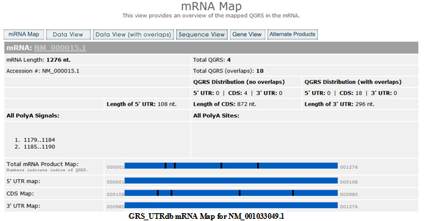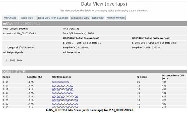 The total number of QGRS is also shown separately for each mRNA section. All known polyA sites and signals are displayed. The page also contains a visual map of the locations of all QGRS in the product.