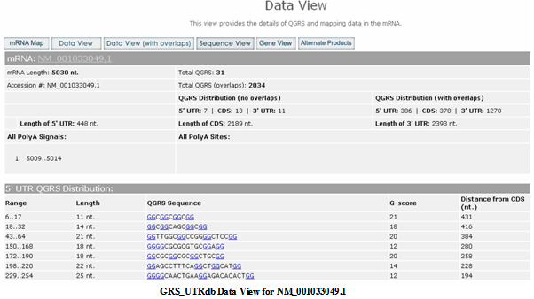 Gives the composition and location of each QGRS in 5 UTR, CDS, and 3 UTR for the mRNA product. Along with the specific nucleotide sequence, with G-groups shown in blue and underlined, the view displays the location, length and G-score of the sequence. Each QGRS is assigned a numerical value, called its G-score. The higher the G-score the more likely will the sequence form a stable unimolecular G-quadruplex. For more on G-scores see the help section