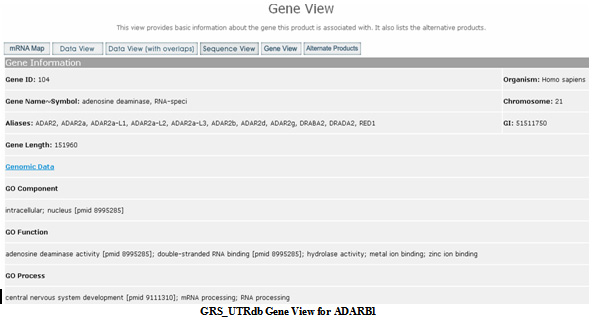 This lists the basic gene information for the mRNA product. A link is given to the NCBI Entrez Gene entry. Also included are all the Gene Ontology terms associated with this gene. Some information is also given for each alternate product associated with the gene and present in the GRS_UTRdb. The information about alternate products can also be accessed directly by the