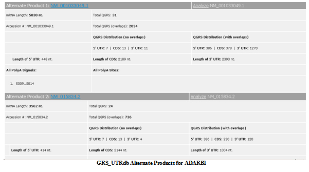 Analyze mRNA column. Suppose we select NM_001033049.1, which corresponds to one of the alternatively spliced products of the ADARB1 (